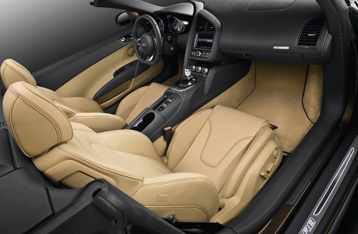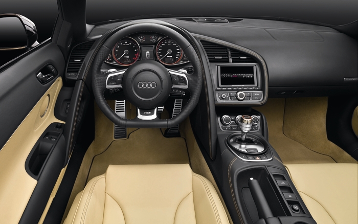 The fit and finish of the R8 Spyder 5.2 FSI quattro is of unmatched quality – typical Audi. The surfaces of the instrument panel and door liners are backed with a soft material and the decorative stitching is extremely precise. Most of the interior is a sportily cool black; the decorative inlays shine with a satin finish and the aluminum applications adorn the door sill strips. Small LED lamps bath the interior in subtle light, if desired. Many of the components in the interior, such as the top sills and the instrument panel cover – are covered in leather.