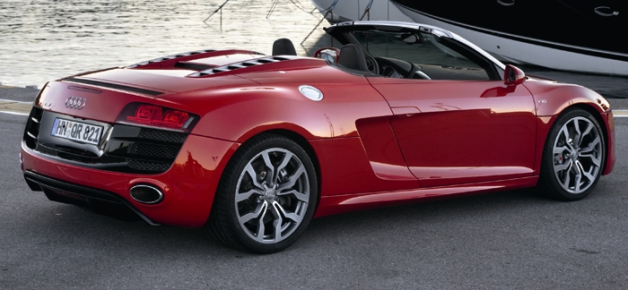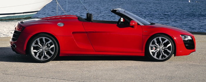 The Audi R8 Spyder 5.2 FSI quattro will go on sale in Germany in the next few days with a long list of standard equipment at a base price of 156,400 euros. This includes power folding side mirrors, a light and rain sensor, LED headlights, an alarm system and a Bang & Olufsen sound system. It pumps out 465 watts and dazzles with excellent sound from 12 speakers. The systems mid-level bass and high frequency ranges have been specially matched to the acoustics in the R8 Spyder.