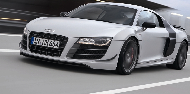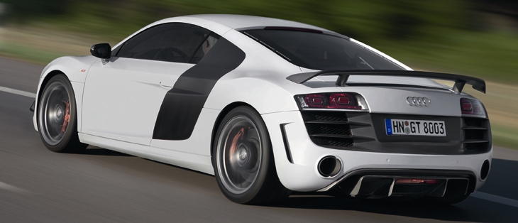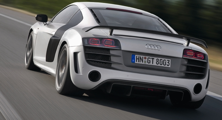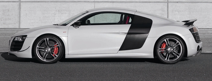 The output of its 5.2-liter V10 has been increased to 412 kW (560 hp); vehicle weight has been reduced by roughly 100 kilograms (220.46 lb). The R8 GT accelerates from zero to 100 km/h (62.14 mph) in 3.6 seconds and reaches a top speed of 320 km/h (198.84 mph). The efficient direct-injection engine consumes only 13.9 liters of fuel per 100 km (16.92 US mpg) on average.