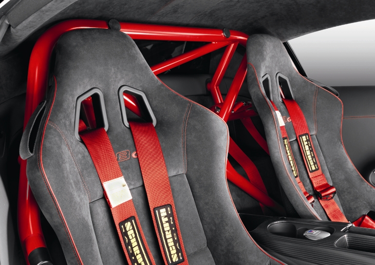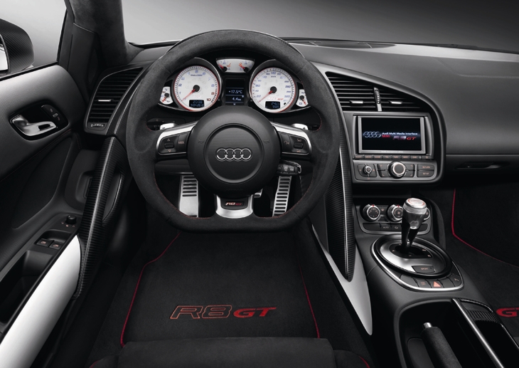 The Audi development engineers also went to great lengths to save weight in the interior of the R8 GT. The new, lightweight carpeting accounts for a weight reduction of 7.9 kilograms (17.42 lb); the bucket seats with a chassis of glass fiber-reinforced plastic (GFRP) account for 31.5 kilograms (69.45 lb).