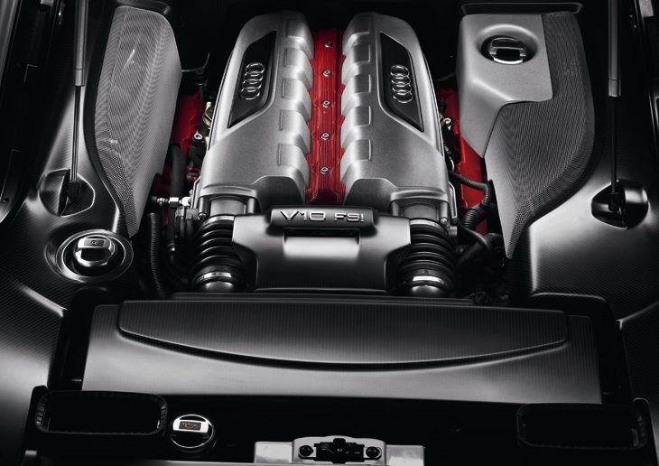 The powerful, normally aspirated engine consumes an average of 13.9 liters of fuel per 100 km (16.92 US mpg) – very good fuel economy given the tremendous power. The FSI gasoline direct injection system injects the fuel into the combustion chambers at up to 120 bar of pressure. Thanks to the internal cooling, this allows a high compression ratio of 12.5:1, which once again benefits efficiency. Tumble flaps in the intake ports optimize the filling of the combustion chambers by inducing a tumbling motion in the inflowing air. The camshafts, as well as the oil pump, water pump and parts of the auxiliaries, are powered by maintenance-free chains located on the rear wall of the engine. This design principle is an exclusive feature of the V8 and V10 engines that accounts for much of the compactness of the complete drivetrain. The induction pipe is made of lightweight plastic and designed for optimized flow conditions through the ports. The engineers consciously decided not to use a variable intake system in order to optimize the engine in the upper rev range.