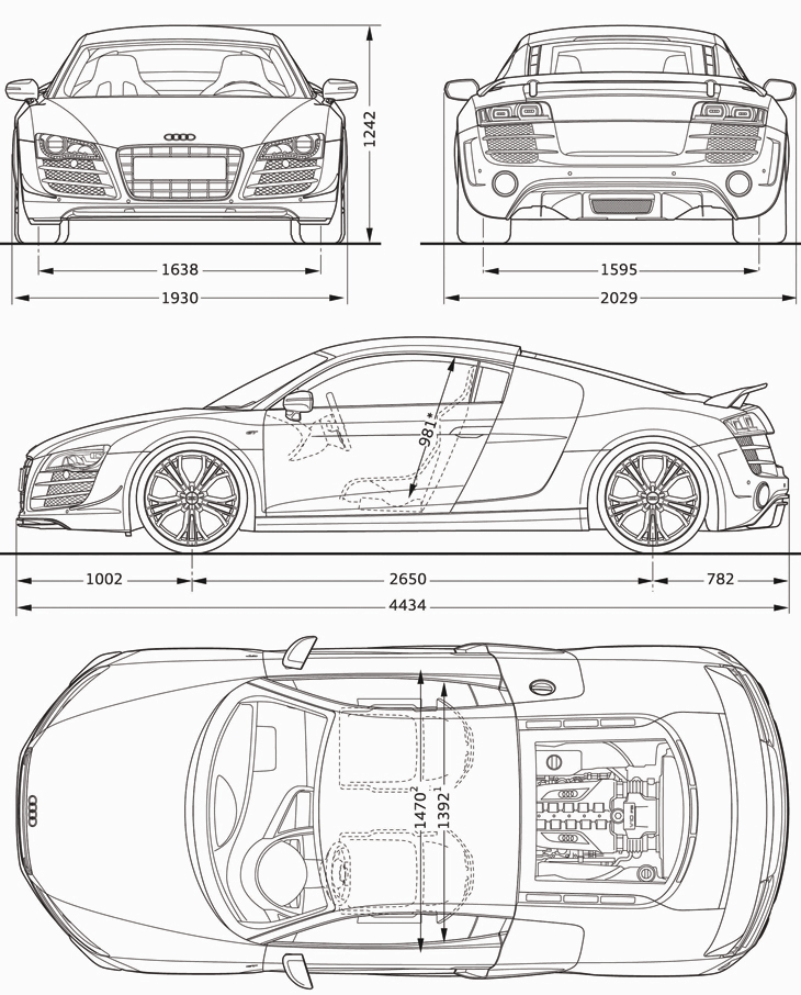 The design of the Audi R8 GT is an expression of highly concentrated power and a technical sculpture. As always with Audi, it concentrates on the pure essence and remains free of unnecessary decorations. The dimensions allude to the contours of the vehicle’s dynamics – 4.43 meters (14.53 ft) long, wheelbase of 2.65 meters (8.69 ft), and 1.93 meters (6.33 ft) wide, but only 1.24 meters (4.07 ft) tall.