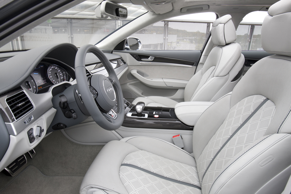 The S8 shares several other A8 interior colors in addition to an exclusive Lunar Silver that includes Gray contrast stitching and piping. Customers can choose decorative inlays available in a choice of four materials that include carbon atlas, matte brushed aluminum, fine grain natural Ash brown wood or layered Oak wood.