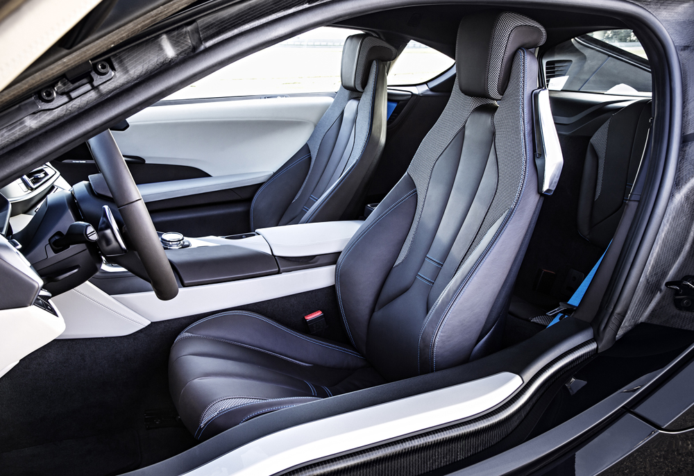 Future-focused design also dominates the interior of the BMW i8. The driver orientation typical of BMW cockpit design is complemented by progressive elements which highlight the sports car’s dynamic flair and light weight. The driver, front passenger and rear passengers sit low down – in traditional sports car style – in lightweight seats. The standard leather trim extends beyond the seat surfaces to parts of the center console, instrument panel and interior door panels. The use of leather treated with natural substances, including olive leaf extract as a tanning agent, underlines the sustainable character of the BMW i8 alongside its exclusivity and sporting allure. Exposed CFRP sections of the passenger cell visible around the entry apertures when the doors are opened provide a reminder of the low weight of the BMW i8.