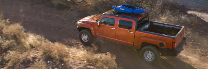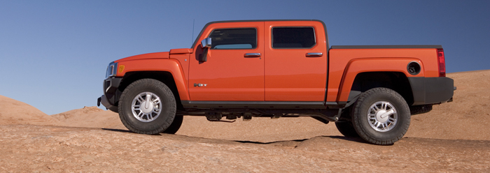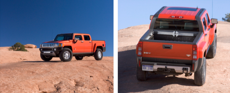 In addition to its segment-defying size, the H3T also stands apart from other trucks with its signature HUMMER off-road capability. It is the only midsize truck to come standard with full-time four-wheel drive, 32-inch tires and functional skid shields. It also is the only midsize truck to offer front and rear locking differentials, as well as 33-inch tires. The V-8-powered H3T Alpha can tow up to 5,900 pounds (2,676 kg).
