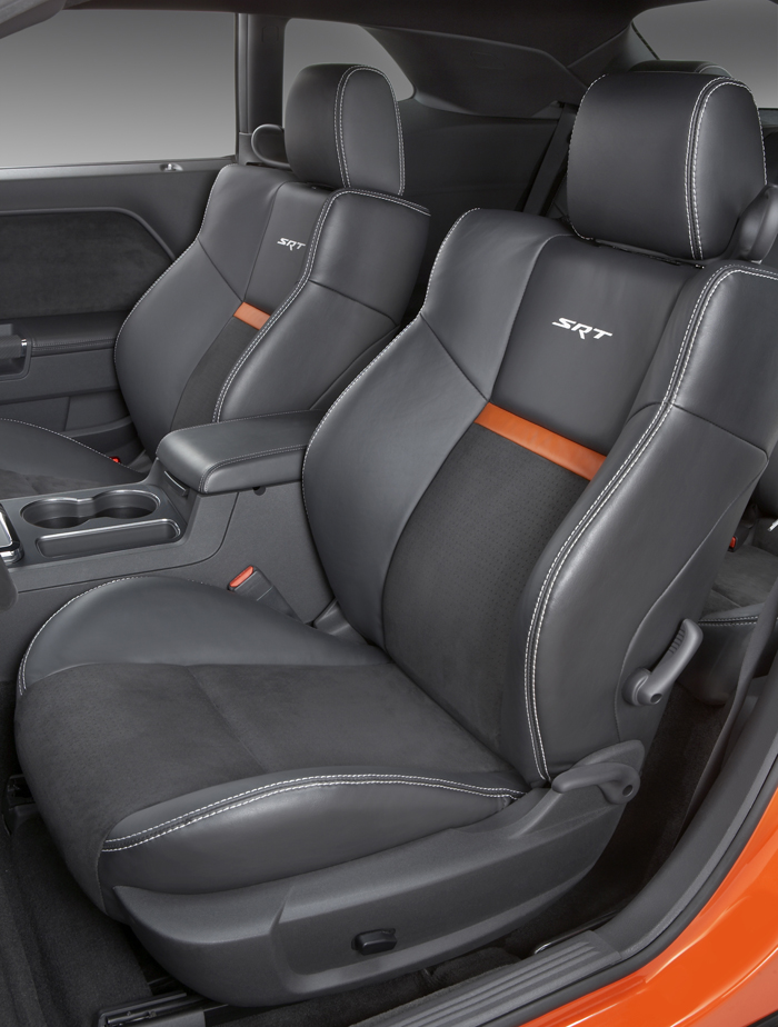 Interior 2008 Dodge Challenger SRT8 highlights include race-inspired leather seats with added bolstering and an exclusive orange accent stripe, exclusive stitched accents on the seats and steering wheel, four-bomb gauges with tachometer and 180 mph speedometer in the center, and an SRT-exclusive Reconfigurable Display (RCD) with Performances Pages that provide drivers instant feedback on 0–60 mph time, 60–0 mph braking, g-forces and ¼-mile time.