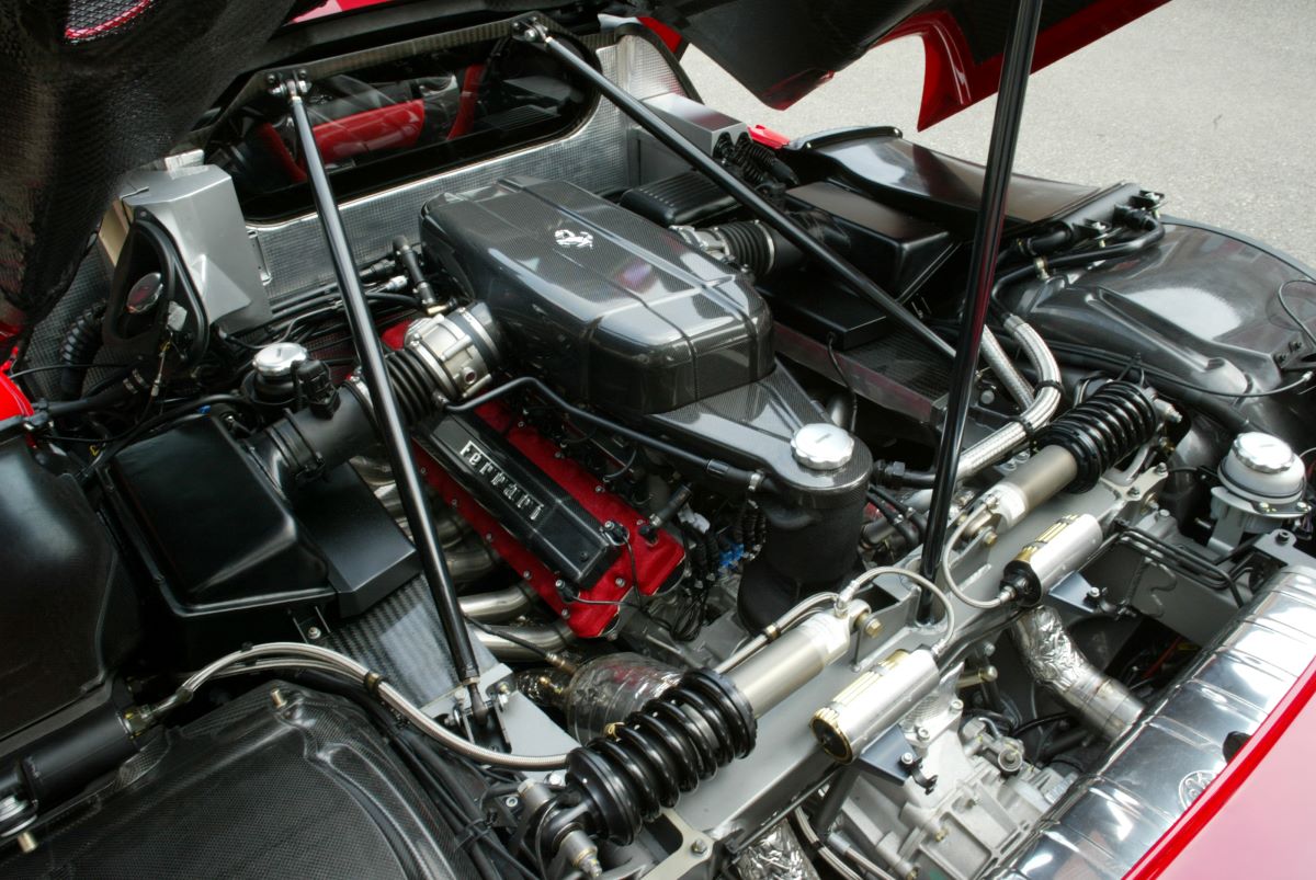 The engine of the Enzo Ferrari (which is known by its project number F140) is a 12-cylinder aspirated unit in a 65° V, a cylinder capacity of 5,998 cc, with a completely new design that draws on experience gained in Formula 1, and has a number of unique technical features. The cylinder head design reveals its Formula 1 origins: the “pentroof-type” combustion chamber, with four valves per cylinder, plus inlet and exhaust ducts designed to maximise the exhaust coefficients and combustion speed. The cylinder case is built of aluminium with press-fitted sleeves lined with nicasil, with seven main bearings, and sleeve intervals of 104 mm. The con rods are made of titanium, the piston design is new, the crankshaft is lighter and the cylinder heads have four valves with high fluid dynamic efficiency, a new structure to increase rigidity, and a different oil discharge layout.