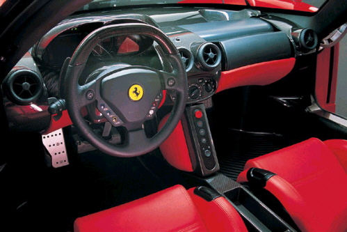 One of the main goals for the interior of the Enzo was to develop the concept of a facia and steering wheel that could optimise the flow of information and the way controls were activated by the driver, to make the so-called man-machine interface much more efficient. One element that helped in this direction is the completely new steering wheel, the upper part of which is made of carbon and bevelled so as not to limit external visibility. It contains a series of LEDs which duplicate the telltales and the rev counter, and the lower part has been optimised to make more space for the driver. Like a Formula 1 steering wheel, it also includes a large number of controls (six) on either side, linked to the main vehicle control functions: vehicle lift, reverse, exclusion/re-engagement ASR, integrated Sport/Race strategy, display configuration.