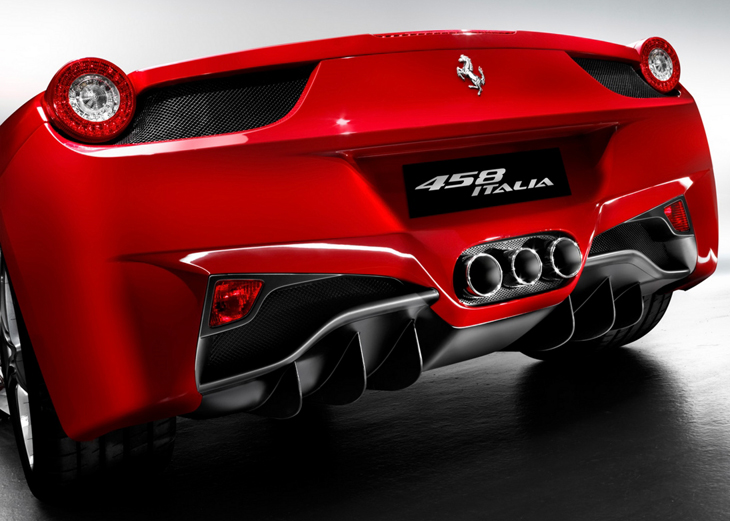 The car’s sills are characterised by two keel forms that act as fairings to the rear wheels, while the rear bodywork between the rear diffusers acts as the surround to the novel triple exhaust tail pipes, a styling cue that recalls the legendary F40 and gives the 458 Italia’s tail an aggressive sporty stance. The engine, in mid-rear V8 Ferrari tradition, is visible below the engine cover.