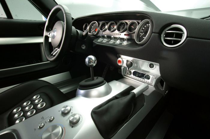 Looking in through the backlight, one finds the essence of the sports car in a 5.4-liter supercharged version of Ford’s MOD V-8 engine. The finishing touches are “Ford Blue” cam covers, each featuring an aluminum coil cover imprinted with the words “Powered by Ford.”