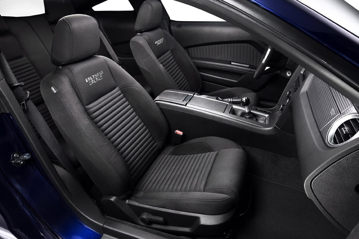 A dark metallic instrument panel finish, gauge cluster and door panel trim also differentiate Boss from the standard Mustang, while a black pool-cue shifter ball and “Powered by Ford” door sill plates further remind customers they’re in a special car.