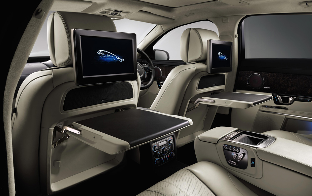 Rear-seat passengers in the LWB version of the 2014 XJ are provided with a wide range of entertainment features. The optional Rear Seat Entertainment package comprises two 10.2″ high-resolution screens mounted on the back of the front seat headrests. These can display inputs from a number of sources; the DVD player, digital TV tuner or an external media player that can be synced through the Rear Media Interface, which provides USB and RCA connections. Audio can be transmitted through the wireless headphones, allowing each passenger to watch separate entertainment sources. The rear seat environment, including the entertainment, is managed by a wireless controller housed in the centre console which also allows passengers to alter their individual climate zones and seat heating and cooling functions.