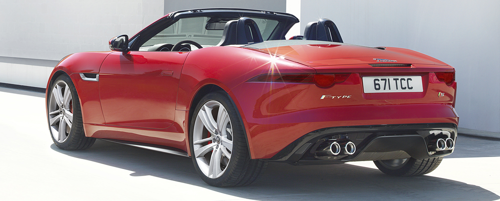 Differing exhaust and tailpipe designs distinguish the V6 and V8 variants of the F-TYPE. The V6 models feature twin center outlets in a nod to the classic Jaguar E-TYPE introduced in 1961. The boldest exhaust finishers ever fitted to a Jaguar, these are stamped from a single piece of stainless steel, creating an unbroken gleaming surface. The V8 S model exclusively features four outboard-mounted exhaust outlets, with twin outlets on each side.