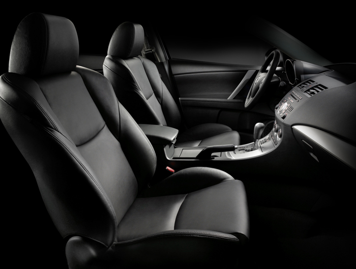 Top versions of the MAZDA3 have a small-diameter leather-wrapped steering wheel and soft-touch surfaces finished with French-stitched seams. Seating areas are available in black or dune colors in both cloth and leather. All MAZDA3 interiors feature a black instrument panel with pewter-painted accents and black carpeting. All models feature a 60-40 split-folding rear seat as standard to stretch the utility of the cargo compartment.