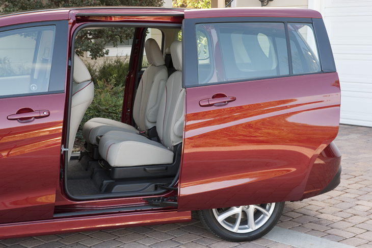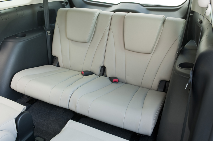 The second row has separate captain’s chairs for added levels of comfort (and to minimize the “he’s touching me” joy when little ones share a bench seat). They slide and recline and can be folded flat without removing their headrests. They also feature a one-touch lever that automatically tips the seatback forward and slides the cushion to its front-most position to allow access to the third row.