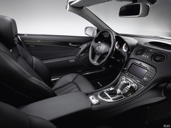 The SL63 comes with a distinctive AMG front hood that’s noticeably different from other SL models, as well as a new front apron with a more pronounced wedge shape, larger cooling air intakes, and a black grille. Bi-xenon headlights with black surrounds and large round fog lights ringed in chrome and set well to the side emphasize the vehicle’s width.