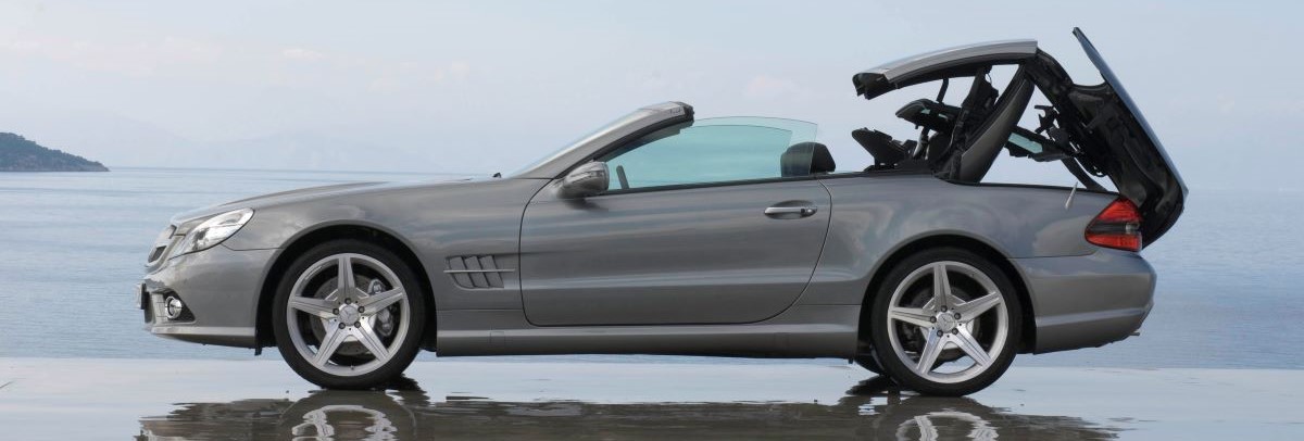At the push of a button, the SL’s retractable hardtop can be fully opened or closed in just 16 seconds, transforming the car from a quiet, weather-tight coupe to a top-down, open-air convertible. A hydraulic pump and 11 computer-controlled hydraulic cylinders power the system, and roof operation is controlled by a switch on the center console. A clever folding design allows for a surprisingly large cargo area of 7.2 cubic feet when the top is down. With the top up, the trunk holds 10.2 cubic feet.