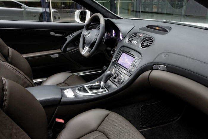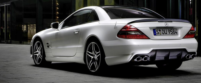 SL63 AMG body styling also includes deeper AMG side sill panels and a beefy-looking rear apron that incorporates a large black air diffuser and two pairs of chrome tailpipes. An AMG rear lip spoiler on the trunk lid reduces lift, especially at high speeds.
