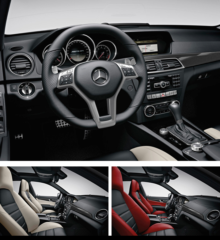 Even a quick glance at the interior of the 2012 C63 AMG sedan reveals the considerable updates, such as the completely new dashboard design with an integrated screen. The new 3D color TFT display in the middle of the redesigned speedometer welcomes the driver upon entry with the AMG logo. The new threespoke AMG performance steering wheel – a feature adopted from the CLS63 AMG – is trimmed in premium leather and features metallic trim elements with a flattened top and bottom sections as well as grip areas which are specially shaped and trimmed in perforated leather for perfect steering control. Aluminum shift paddles facilitate manual gear changes.