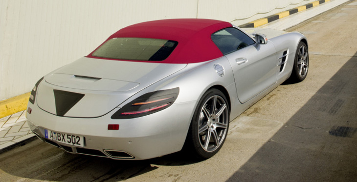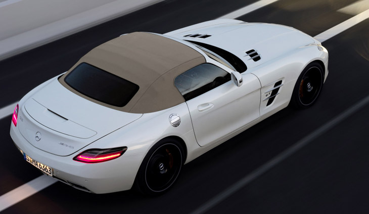 The three-layered fabric soft top is a weight-optimized magnesium/steel/aluminum construction, and contributes greatly to the car’s low center of gravity. The soft top has a seamlessly bonded rear window of heated singlelayer safety glass. The flush, gap-free transition between the outer roof skin and the rear window keeps wind noise low. A continuous, flexible water pocket running under the soft top catches rainwater and directs it to the underbody via two apertures on each side. The trunk capacity is 6.1 cubic feet with the roof either open or closed, and therefore roughly equal to that of the SLS AMG Coup (6.2 cubic feet).