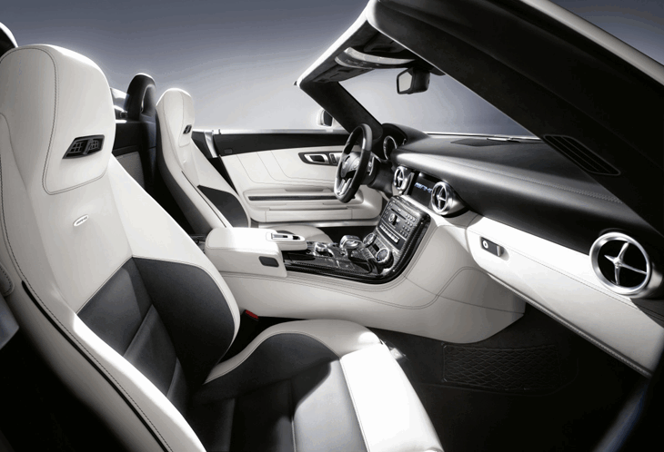 Designed to hug occupants but not be overly tight, high-bolstered SLS AMG seats are upholstered in premium designo leather with integral head restraints, an adjustable lumbar feature and power adjustments that are mounted on the bottom cushion. Standard equipment includes memory buttons that can store seat, steering wheel and outside mirror positions for three different people.