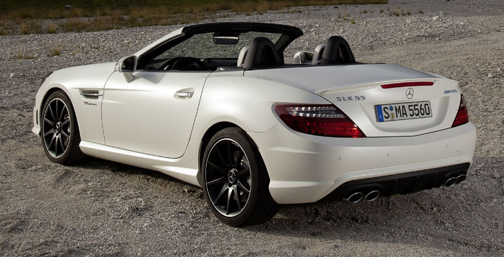 Forming part of the third-generation of the SLK launched in June, the new AMG model catches the eye at first glance: distinctive AMG light-alloy wheels, exclusive AMG body styling with AMG spoiler lip and two chrome-plated twin tailpipes at the rear complement the classic roadster proportions, while adding a distinct athletic touch. The expressive design of the 2012 SLK55 AMG is both eye-catching and unmistakable.