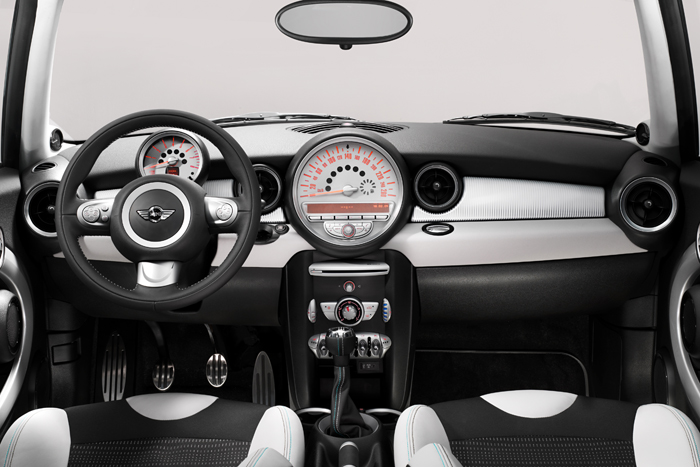 The interior of the MINI 50 Camden comes in an equally contrasting colour scheme combining the Carbon Black interior colour with special trim on the instrument panel interchanging from white to silver, like the caps on the exterior mirrors.
