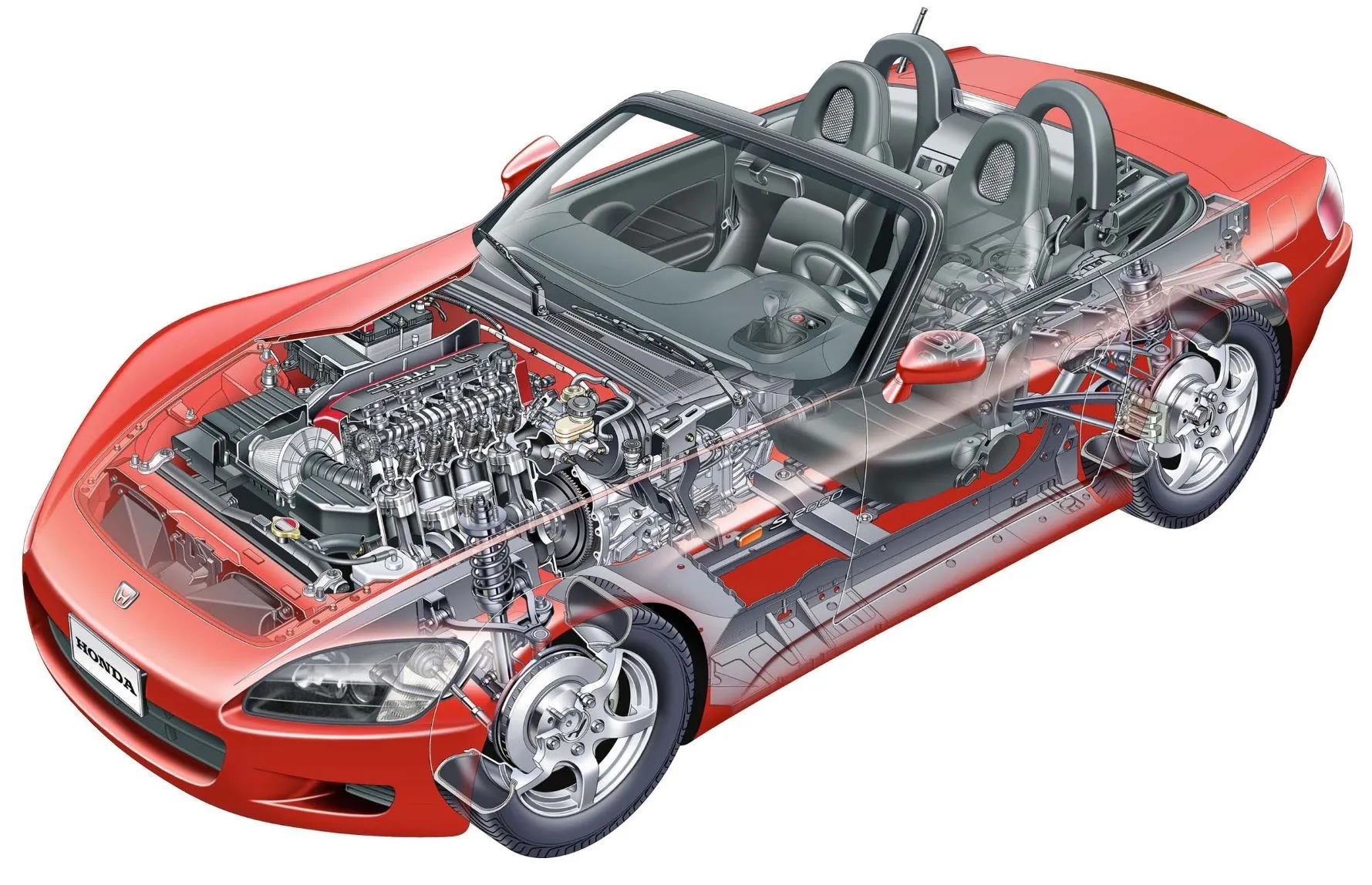Detail changes to the ancillaries and their drive system on the 2.0-liter S2000 engine allowed Honda engineers to pare about two inches (50 mm) from the front of the engine, compared to Honda’s 2.2-liter Prelude engine, making it around the same size as the smaller 1.6-liter Civic engine.